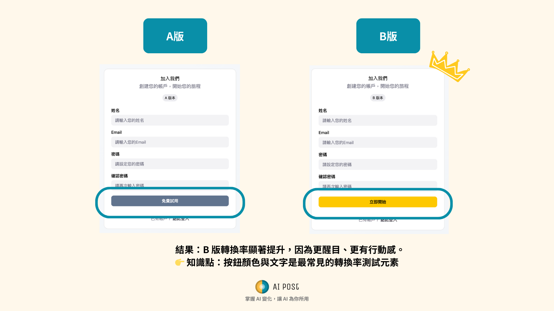結果:B 版轉換率顯著提升,因為更醒目、更有行動感。
