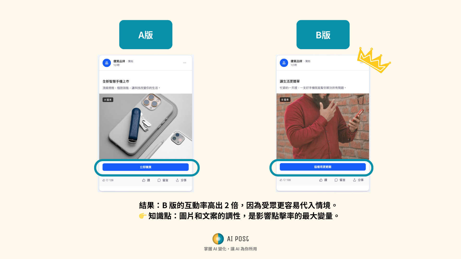 - 在社群廣告裡,你可能會測試「產品特寫」vs「生活情境」圖片,看哪個帶來更多互動。