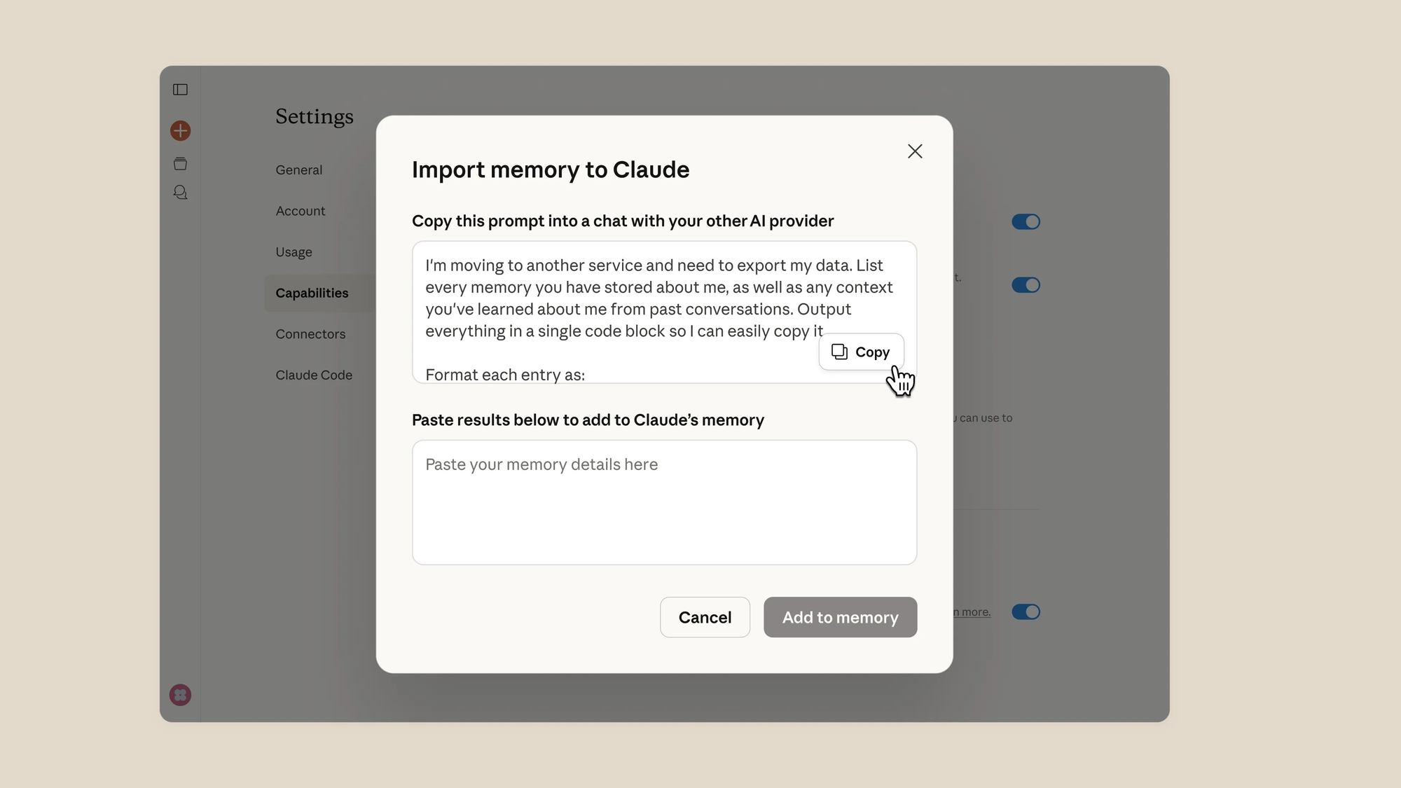 這項功能可以讓使用者能透過特定提示詞,將過去在 ChatGPT、Gemini 或 Copilot 等平台累積的對話上下文與個人偏好,無痛轉移至 Claude。作為一般使用者來說,在軟體市場(無論 AI 或非 AI),很容易忽略的一件事情就是轉換成本;使用者在一個平台投入越多時間,就越難離開。而這個痛點在傳統的 PKM 工具 ( 知識管理工具,如 Notion 或其他筆記服務 )上非常明顯,並同樣發生在 AI 工具的使用上,所以 Claude 這次的推出,基本上可以說是福音了。