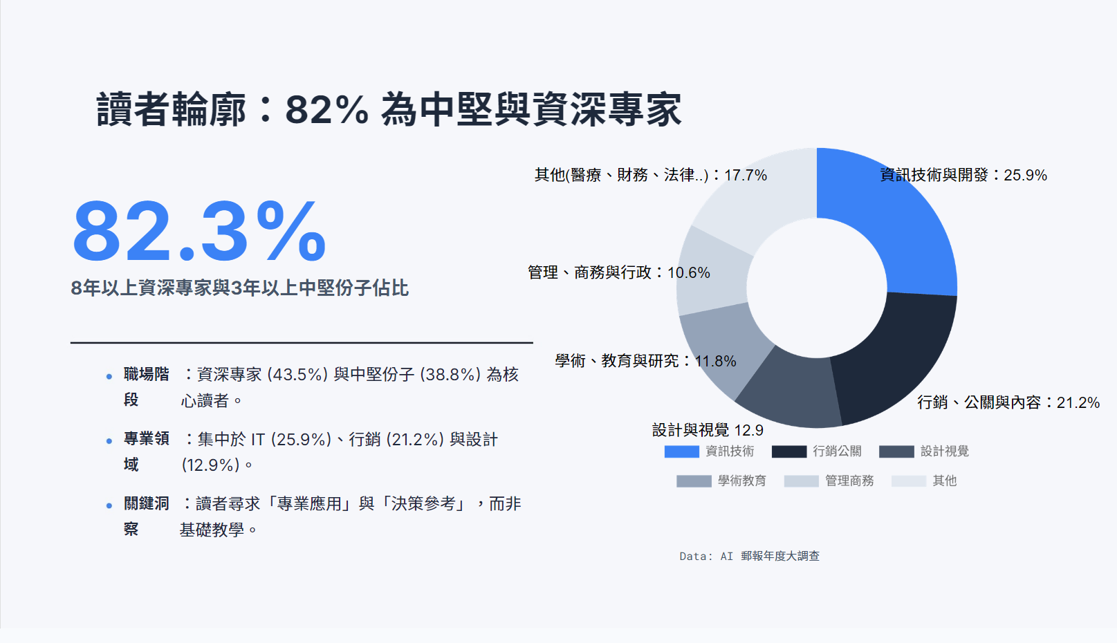 - 資深與中堅: 82.3% 的讀者為擁有 8 年以上經驗的資深專家或 3 年以上的中堅份子。