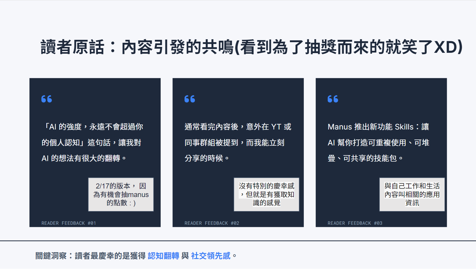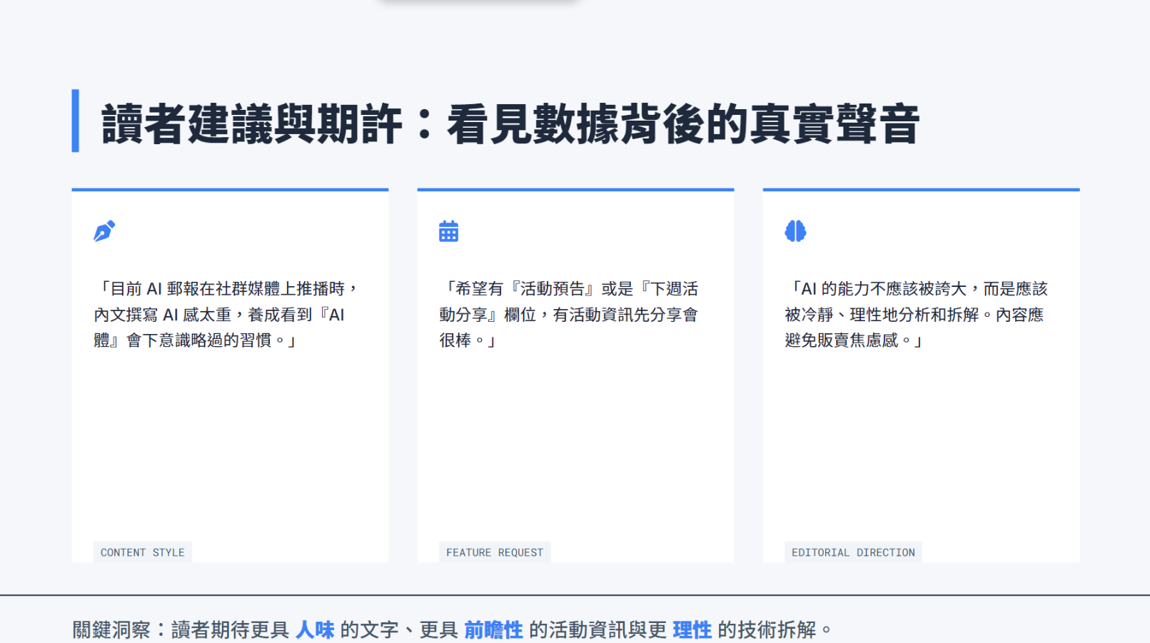 - 有讀者坦言,當內文撰寫「AI 感」太重時,會因為大腦疲勞而下意識略過。其實這也讓我們團隊思考跟討論了一下,在社群上因為求資訊快,我們會將 AI 參與度拉到 70% - 80%,以應對目前日變的 AI 迭代環境,而在網站、電子報的文章中,我們會下降至 30-40%,更多是我們團隊的經驗以及專家的 Insight 分享。