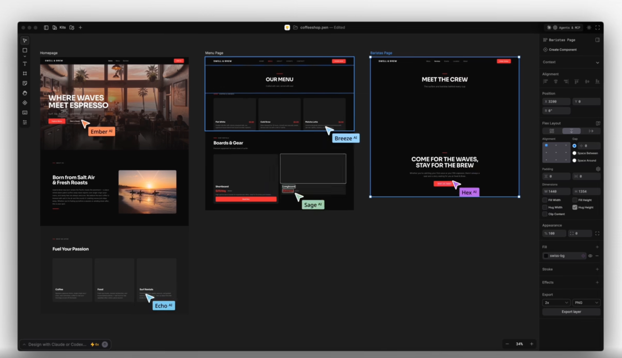 以往使用 Pencil 時,AI 只能依照指令逐一生成畫面;但在 SWARM Mode 下,多個 AI Agent 可以同時開工: