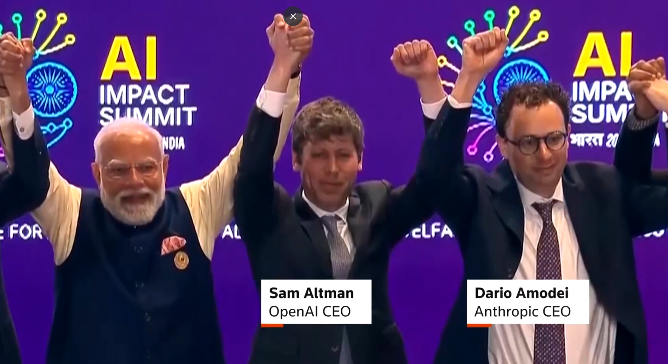 當時印度總理莫迪(Narendra Modi)熱情地拉起左右兩側——OpenAI 的 Sam Altman 與 Google 的 Sundar Pichai 的手準備高舉慶祝。而理應也牽起手的 Dario Amodei 與 Altman 可能是因為今年超級盃事件,遲疑數秒,最後選擇尷尬的握拳舉起手臂。
