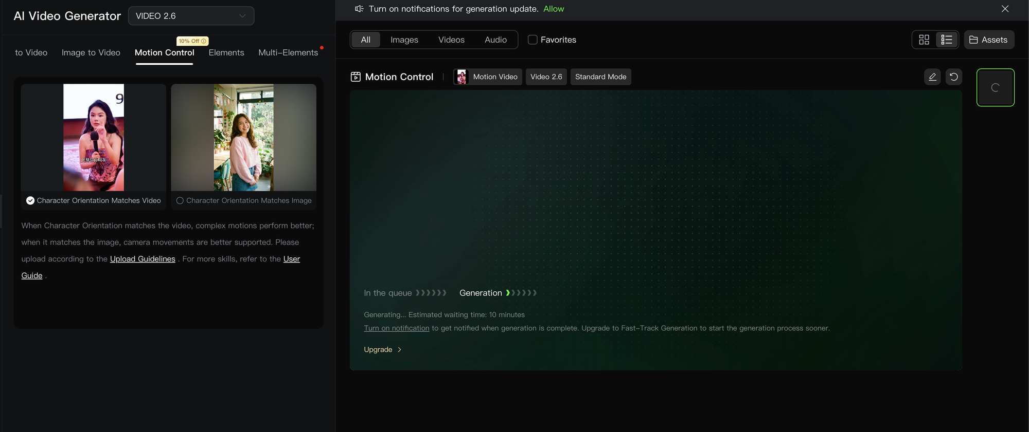 訪問 Kling AI 官方網站 → 登錄帳戶 → 進入「視頻」→ 選擇「Kling VIDEO 2.6」→ 點選「Motion Control」