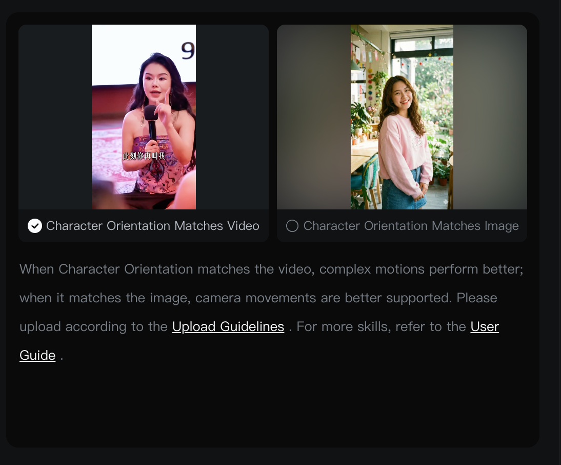 - Character Orientation Matches Image:角色方向固定,執行視頻動作
