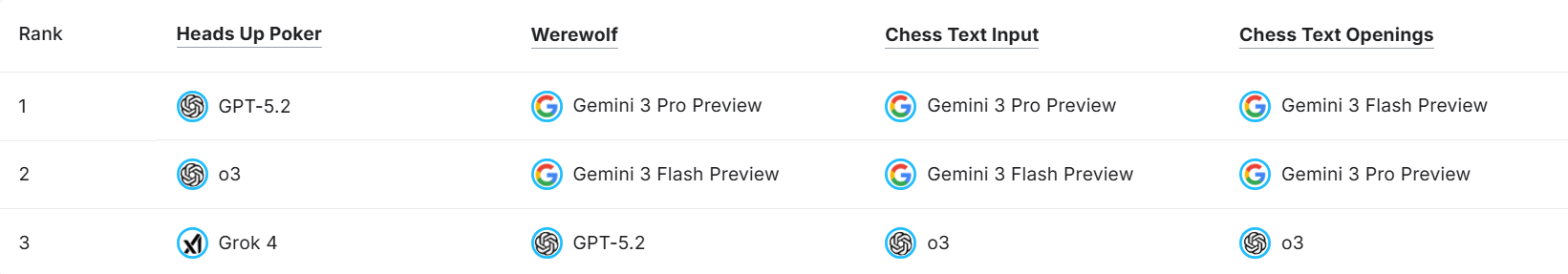 - 嚴格的限制:在 Game Arena 中,模型不能調用外部工具,且如果連續四次提交非法走法直接判輸。這是在測試模型對「規則約束」的底層理解力。