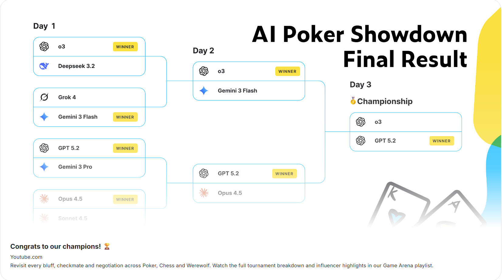 過去我們判斷一個 AI 模型強不強,除了用戶自己的使用體驗外,客觀的就是那一堆SME什麼鬼的評分標準或是靜態題庫,但這週 Google 旗下的 Kaggle 推出了 Game Arena,正式宣告 AI 進入了「動態競技」時代。這是一個讓頂尖模型(如 GPT-5、Gemini 3、Claude 4)在德州撲克或是狼人殺這種策略型遊戲中,進行 1 對 1 真人秀般的對決平台。