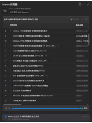 - 多代理協同作業:例如,Manus AI 最新的 Wide Research 功能,能同時啟動多個代理並行運作,舉個簡單的例子來說,你跟 AI 說你要查一百個產品,他會先設立一個 Todolist,然後分出一百個 AI 來查,能快速處理多重任務,顯著提高工作效率。這樣的協同運作大幅減少了人工操作的時間,使你能在短時間內完成更多工作。