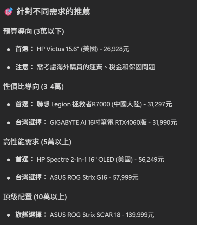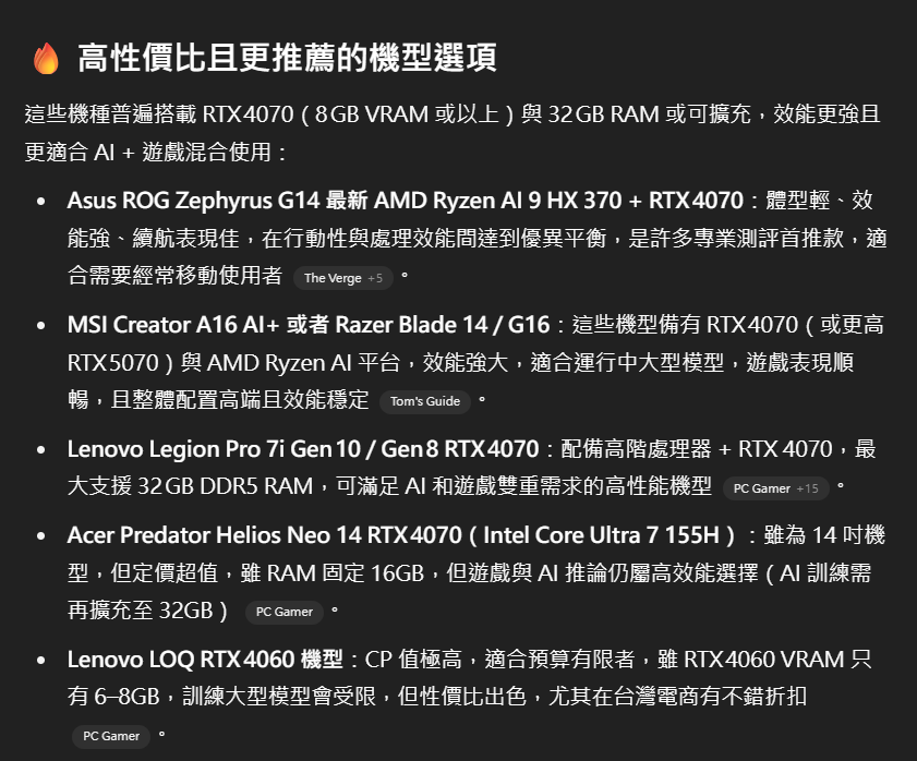 我想找一台能跑 中大 AI 模型的筆電,有開發、玩遊戲的需求,請幫我查詢海內外不同平台的價格,並統一把幣值換成台幣