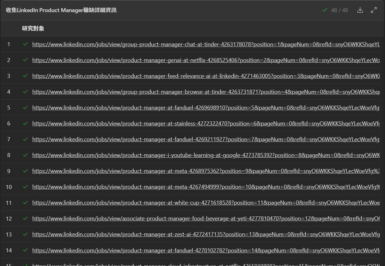 接著 Manus AI 針對 Linkedin 上前十大科技公司的 PM 職缺執行 Wide Research,找到了 48 個職缺,然後分別指派約 10 個 AI 依序處理任務。