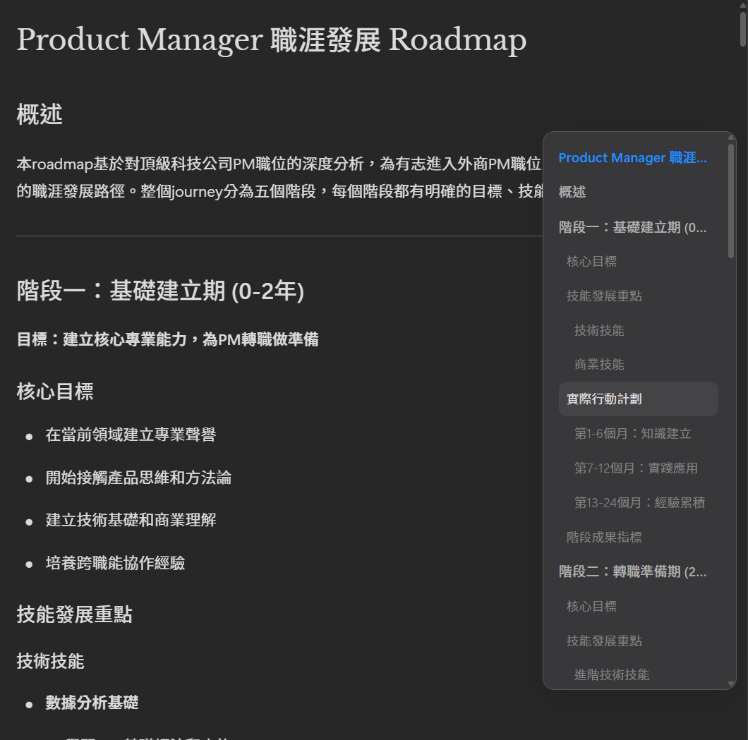 在 Manus AI 整理完 LinkedIn 上的職缺資料後,生成了一份清晰的職業規劃報告。這份報告不僅列出了所需的技能和經驗,還幫我提取了相關的職位描述,並且整理成一份具體的職業路線圖,幾分鐘內就完成了這項任務。