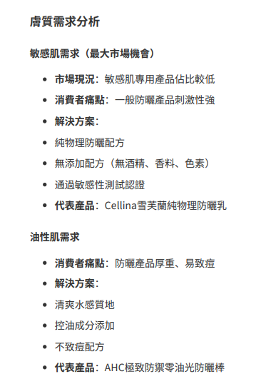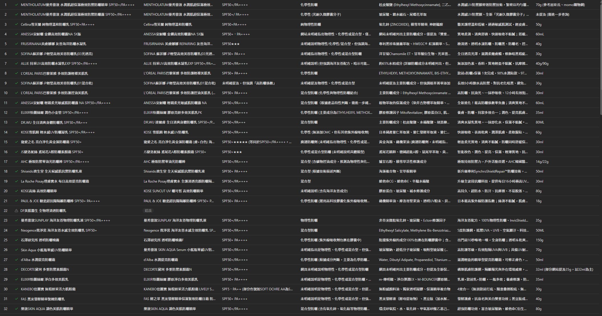 請幫我整理市面上一百種防曬乳,並分析主要成分和特點 做成競品分析報告
