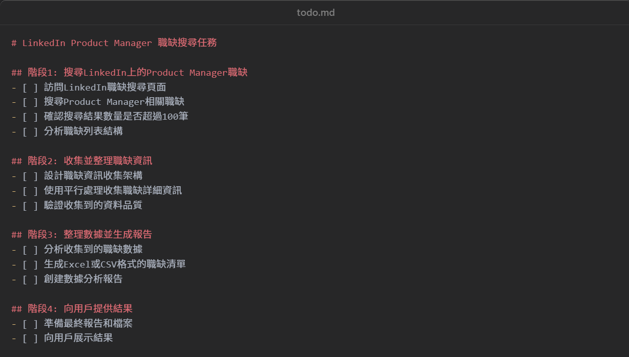 這是我給他的提示詞,在接受到用戶的需求後,Manus AI 會整理一個「任務 Todo」,我現在用 AI 有個小習慣,不會讓 AI 直接幫我把任務完成,反而是先請他把 Todo 或是大綱列好,再一步一步調整。