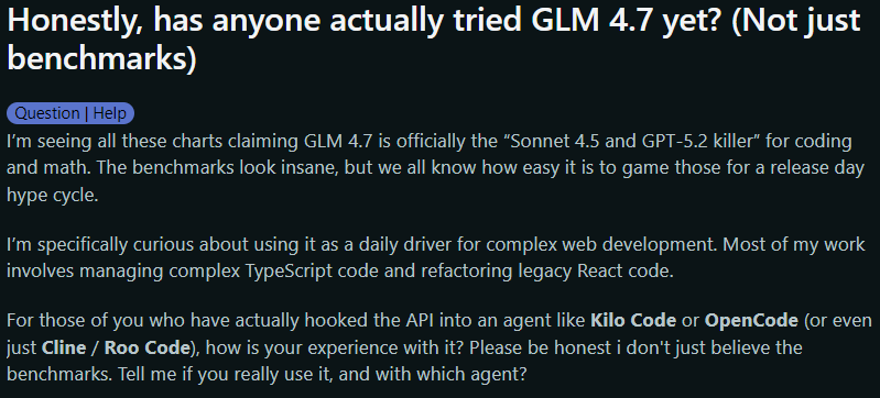 根據首批使用者的真實反饋,GLM-4.7 在前端開發的表現上有顯著提升,生成的頁面結構更乾淨、組件層級更清晰,美觀度遠超前代。然而在實戰體感上,GLM-4.7 雖然在簡單任務的指令上非常精確且反應迅速,但在處理高難度重構或多步推理任務時,一旦出錯,其自我修復能力仍與舊版 4.6 一樣,有時甚至需要開發者花費額外的調試時間,所以更多時候使用者會選擇使用 Claude 3.5 Sonnet,在處理複雜計畫與自動修復時有很高的成功率。
