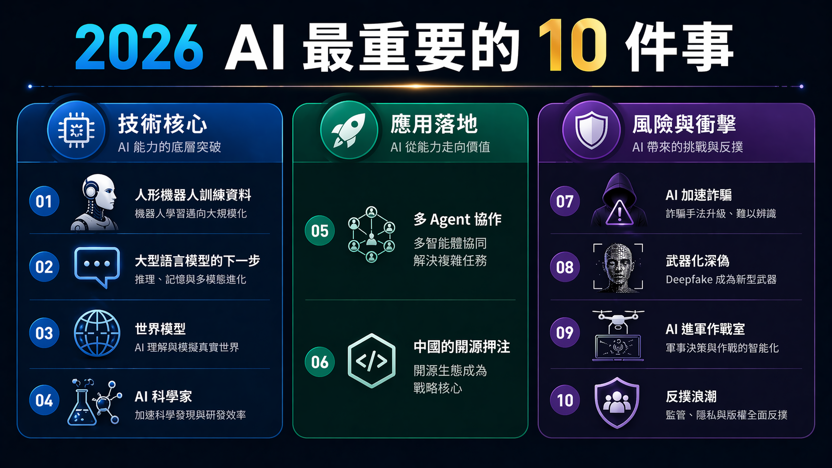 影響最直接的是 AI 加速詐騙(立即影響日常生活)、武器化深偽(影響如何判斷媒體真偽)、多 Agent 協作(影響未來工作流程與工具選擇),以及中國的開源押注(免費 AI 工具選擇增加,但需要評估風險)。LLMs+ 雖然偏技術,但它決定了未來你用的 AI 工具進化速度和方向。