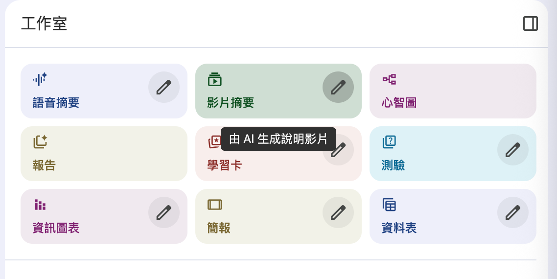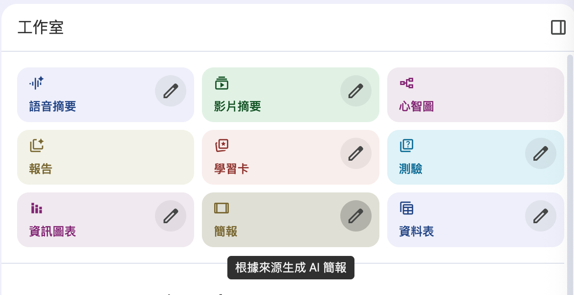 小提醒:NotebookLM 有時會在你剛加入來源時,先自動生成一些輸出(例如報告、投影片、影片等),這些通常是「一次性」的引導內容。