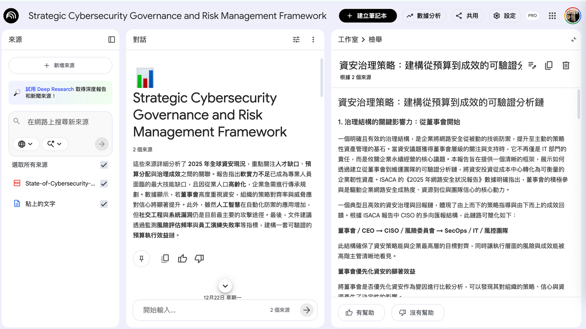 你問它問題、請它做投影片,它會把回答「對應回你的來源」,並提供內嵌引用,讓你能回頭核對。