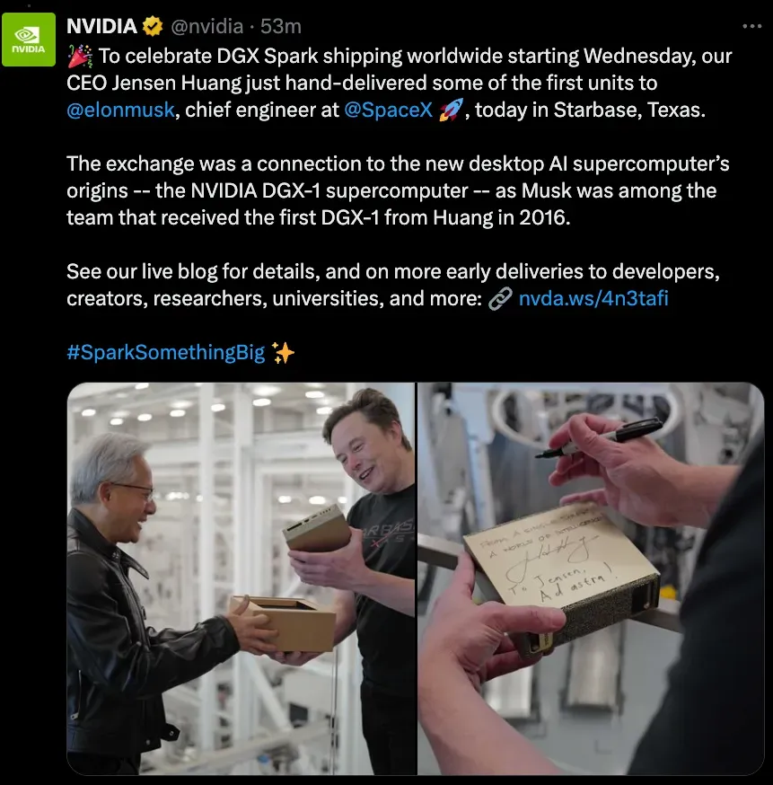 NVIDIA創辦人暨執行長黃仁勳於10月13日親自前往德州SpaceX星艦基地,將首批DGX Spark親手交付給SpaceX創辦人伊隆·馬斯克。這個象徵性的時刻呼應了2016年的歷史場景,當時黃仁勳將第一台DGX-1超級電腦交付給馬斯克當時的新創公司OpenAI,該系統後來為ChatGPT的發展奠定了基礎。