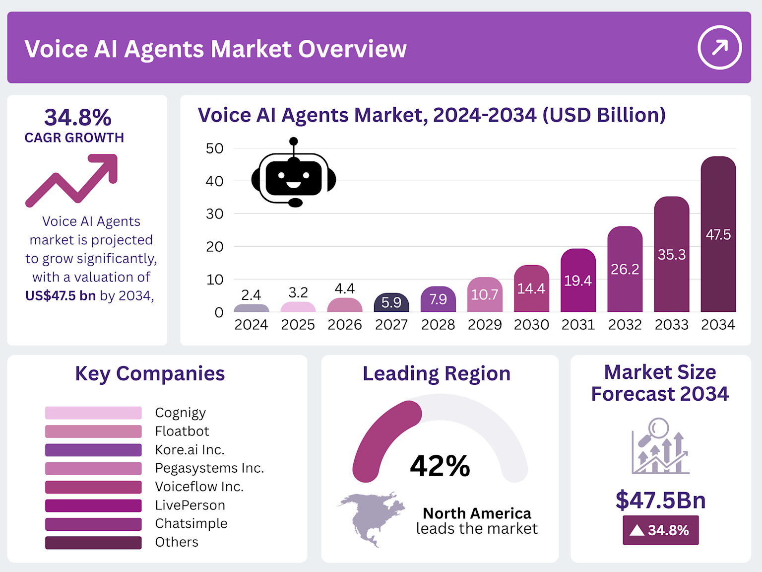 根據最新市場研究數據,全球語音 AI 市場正經歷爆發式增長,預計將從 2024 年的 24 億美元增長到 2034 年的 475 億美元,複合年增長率高達 34.8%。北美市場在全球語音 AI 市場中占據 42% 的領導地位,成為技術創新和商業應用的主要推動力。