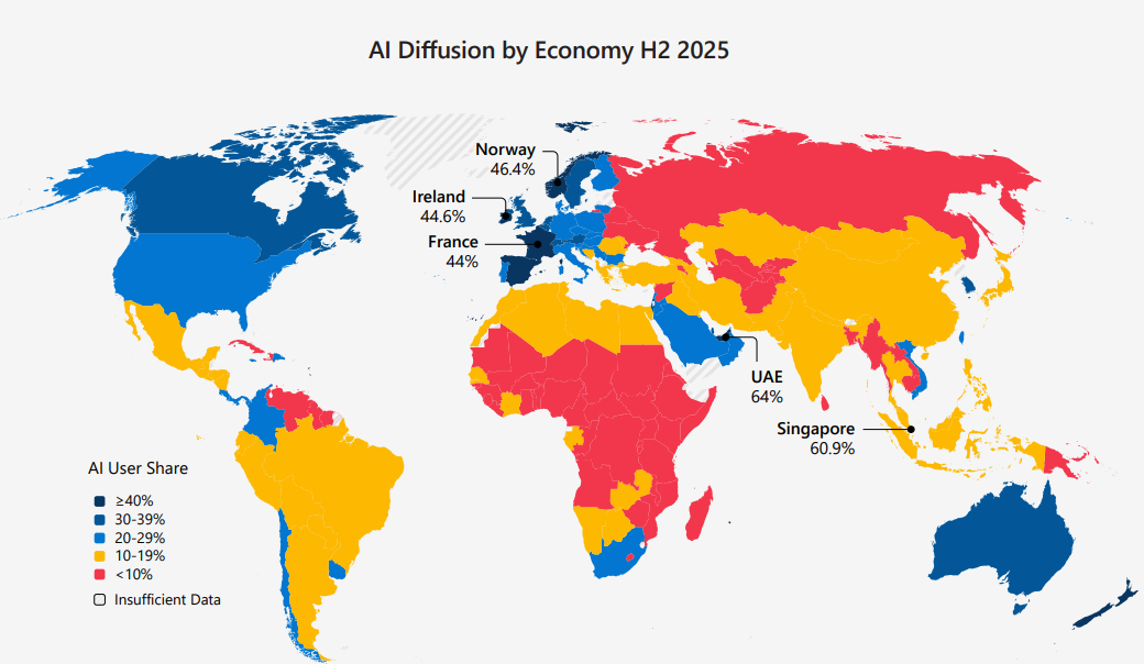 Microsoft 旗下 AI Economy Institute 最新發布報告,揭示截至 2025 年底,全球 AI 使用率達到 16.3%,但國與國之間的落差正在快速擴大,尤其是在經濟體之間。