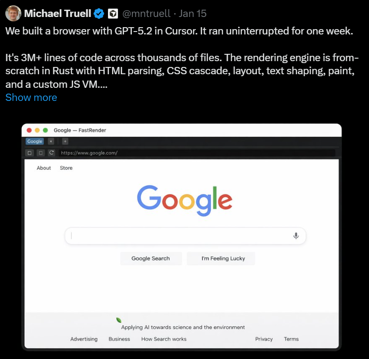 你以為 AI Vibe coding 只是寫一些小應用、改幾行 code 嗎?Cursor CEO 在 Twitter 分享他們最新的實驗,讓 AI Agent 打造瀏覽器,對,不只是網站,而是瀏覽器。他們讓數百個 GPT-5.2 coding agents (當然是透過 Cursor) 自主運行幾週,從零打造出一款能正常跑網頁的瀏覽器,代碼量超過 300 萬行。
