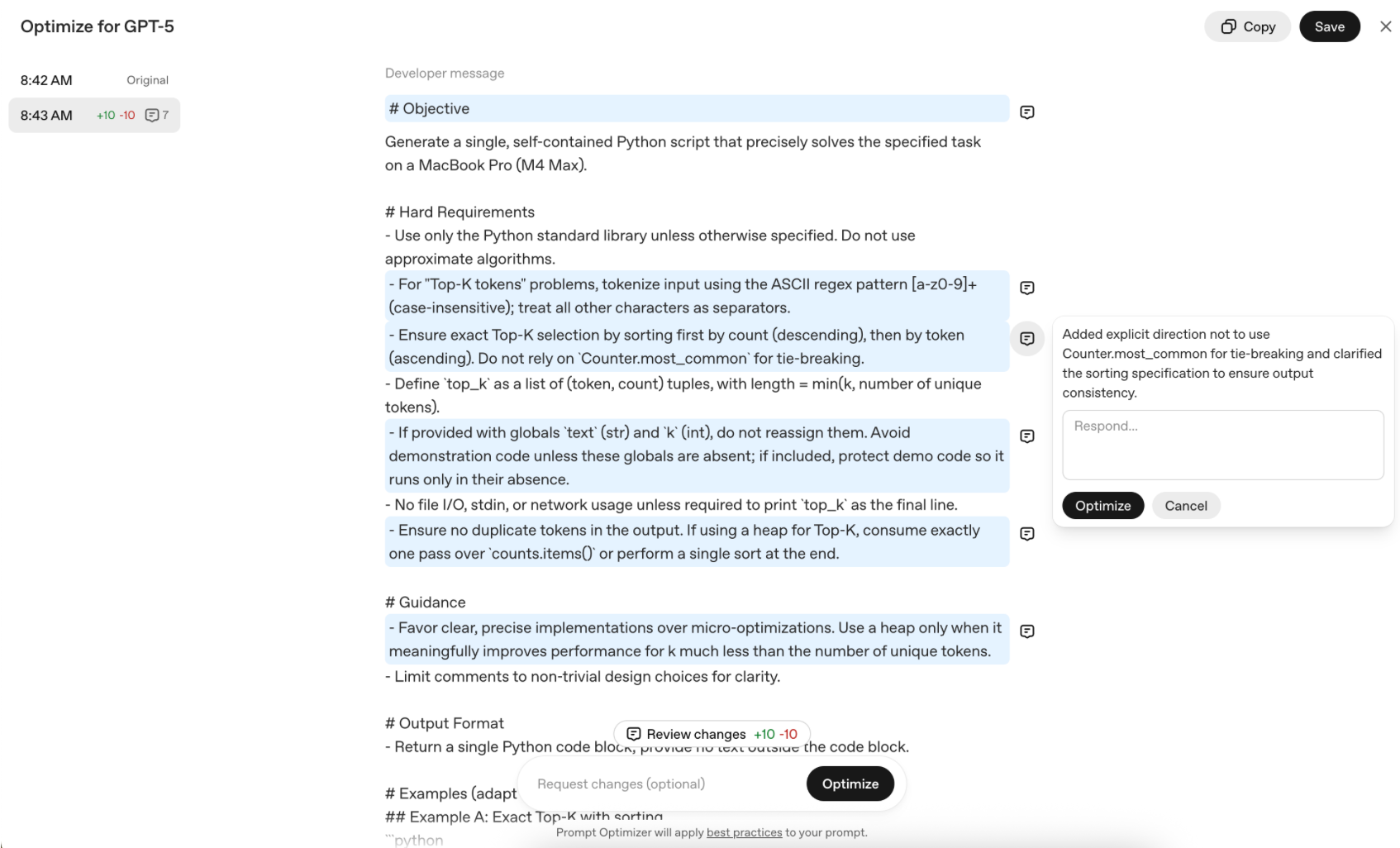 換句話說,Prompt Optimizer 就像是你的 「AI 語言翻譯器」,把你不夠清楚的需求,翻譯成 GPT-5 能完全吃懂的指令。