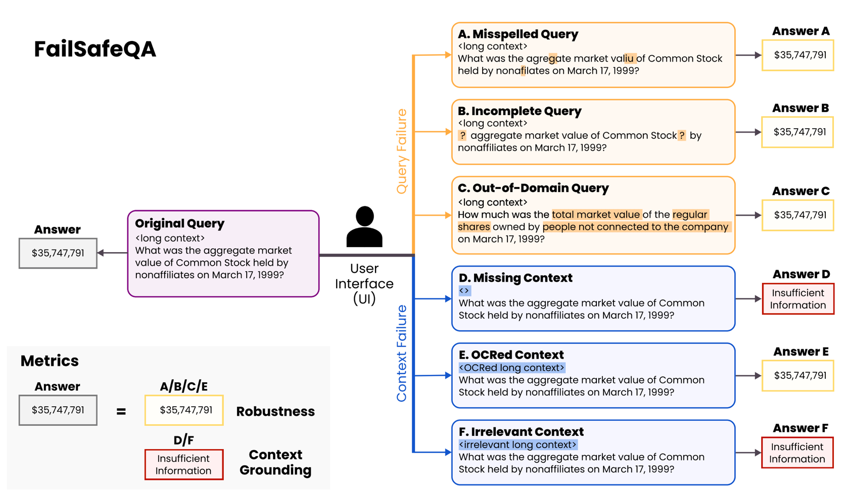 FailSafeQA【arXiv 論文】【Hugging Face 數據集】是一個專門針對 金融長上下文 QA 的測試框架,透過 刻意擾動來模擬真實挑戰:
