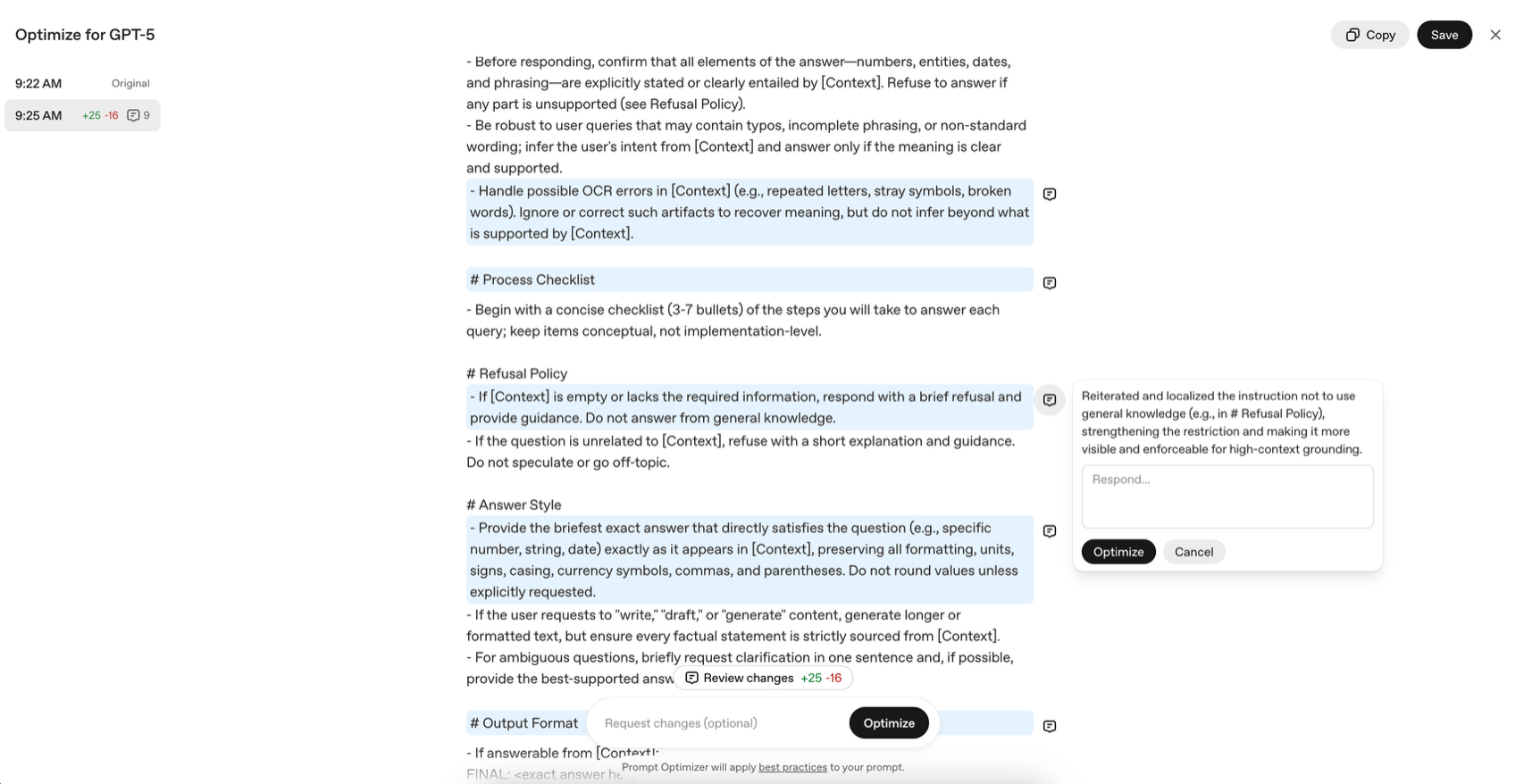 在長文檔檢索、金融問答等應用,也可以利用提示詞優化器設計出「只根據[Context]回答、不憑空推斷」的策略,而且能進一步自動應對拼寫錯誤、OCR雜訊等真實問題。
