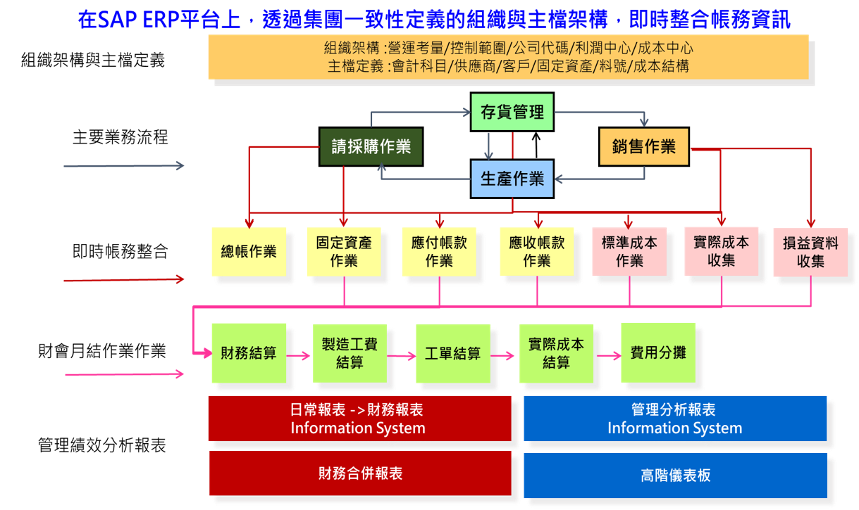 第一層:流程標準化,解決跨國營運亂象以 S/4HANA PCE 為基礎,導入採購、倉儲、銷售、生產、財會與成本管理模組,建立集團標準流程。PwC Consulting 以 SAP 典範流程(Best Practice)為導入基準,加速流程落地。主檔資料集中維護(如物料、供應商、客戶與價格),並導入 PDA 與倉儲系統,提升現場作業效率。