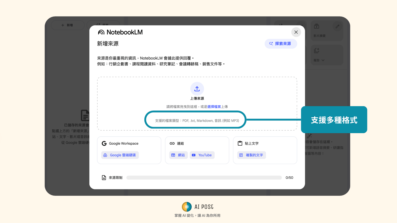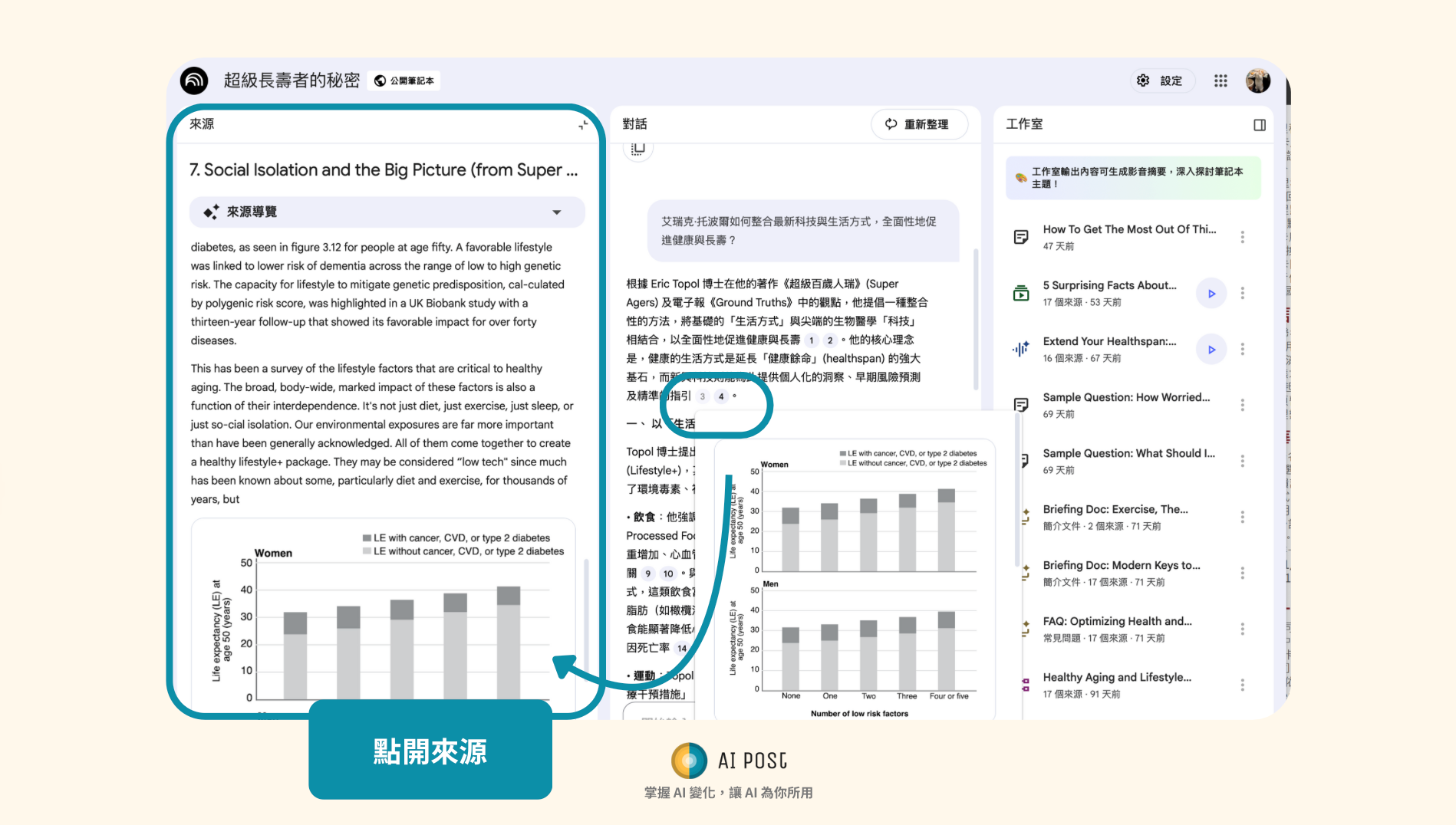 - Audio Overview:自動生成語音 Podcast,把文件重點讀給你聽