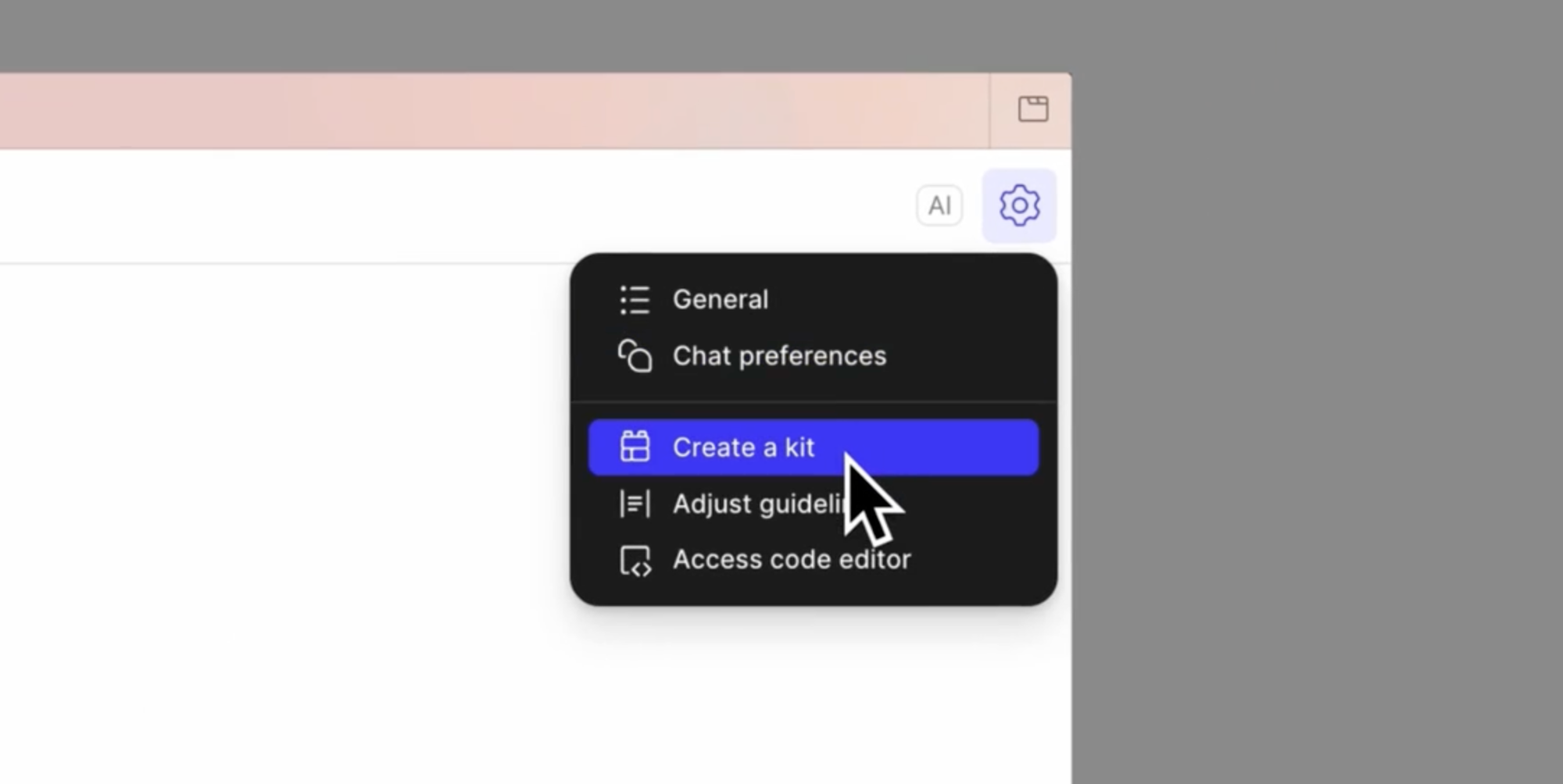 首先,打開 Figma 的 Make 介面。在頁面右上角找到 Settings 圖示並點擊,選擇「創建一個 Kit(Create a Kit)」。