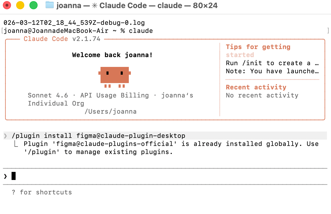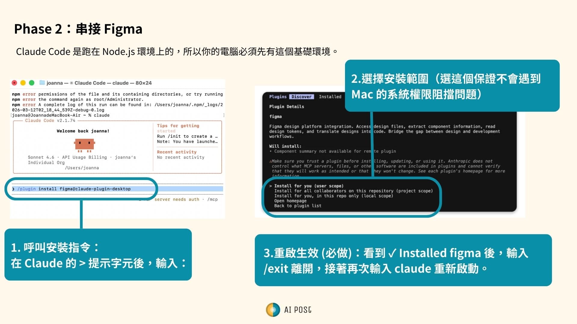 Install for you (user scope) (選這個保證不會遇到 Mac 的系統權限阻擋問題)重啟生效 (必做):看到 ✓ Installed figma 後,輸入 /exit 離開,接著再次輸入 claude 重新啟動。