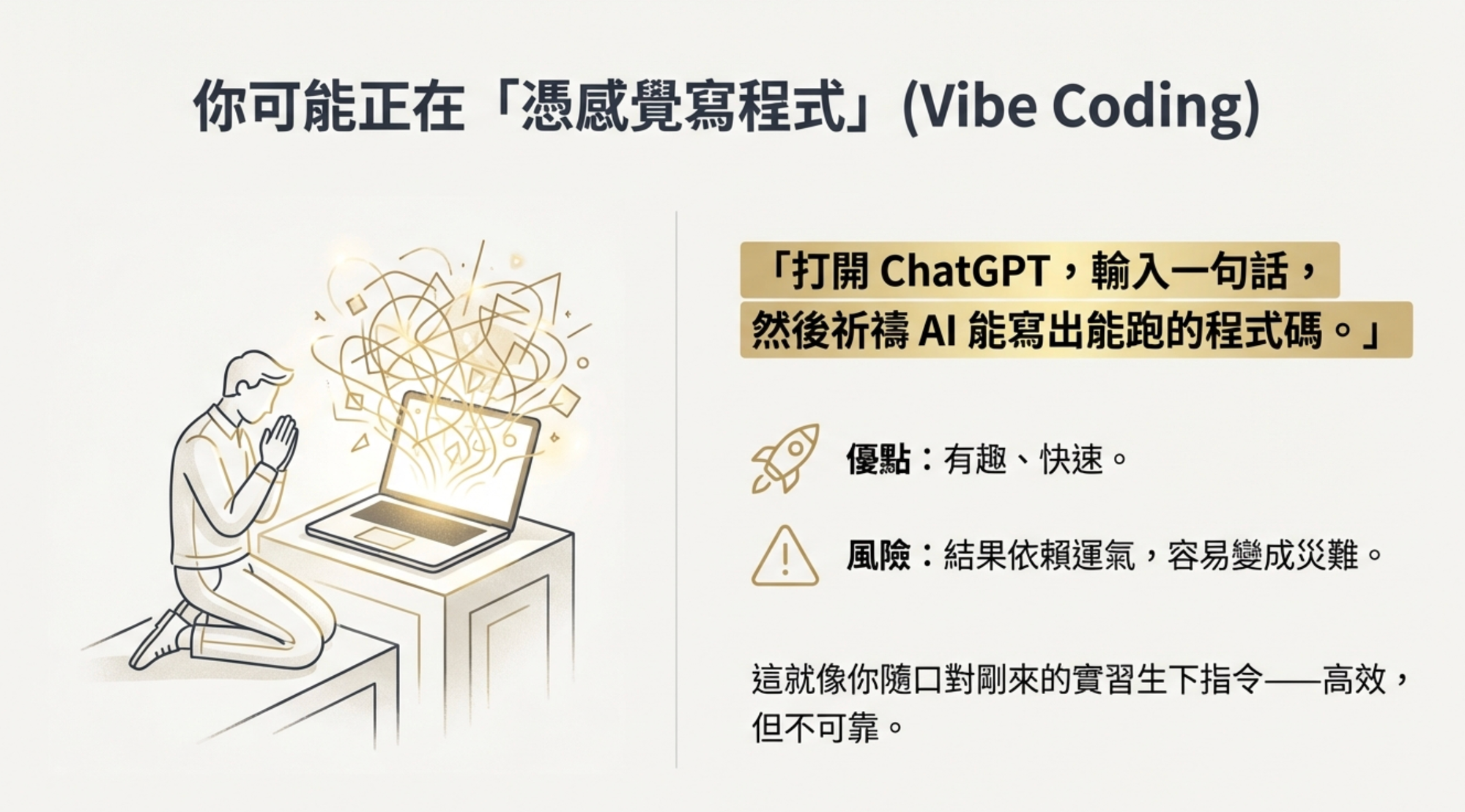 你可能聽過「Vibe Coding」(憑感覺寫程式)——打開 ChatGPT 或 Cursor,輸入一句話,然後期待 AI 直接吐出能跑的程式碼。它確實很快、很爽,但也常見三種失控: