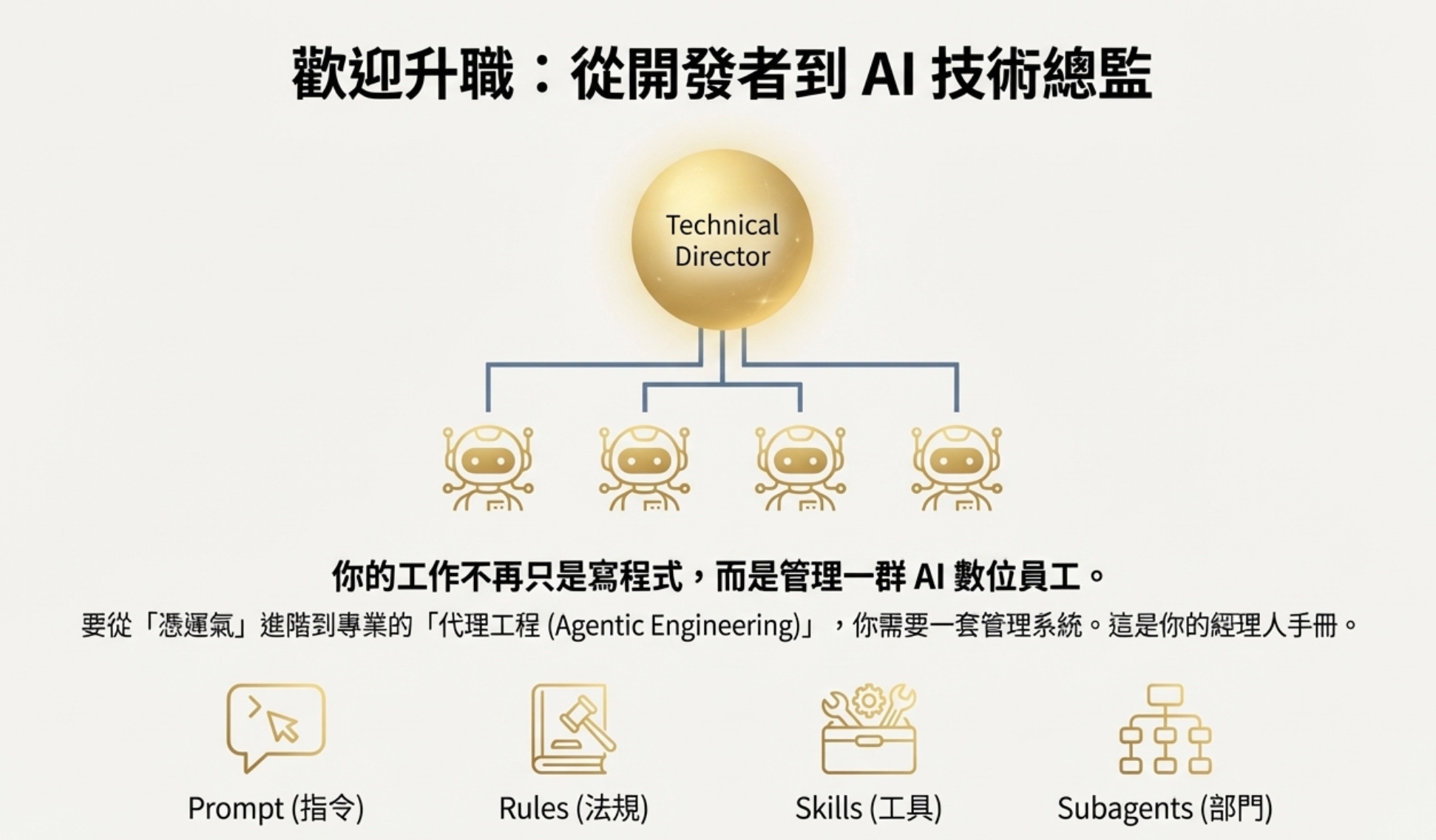 要從「憑運氣」進階到專業的 Agentic Engineering,你要做的不是更會下 Prompt,而是學會把 AI 當作一支團隊管理:你是技術總監,AI 是你的數位員工。