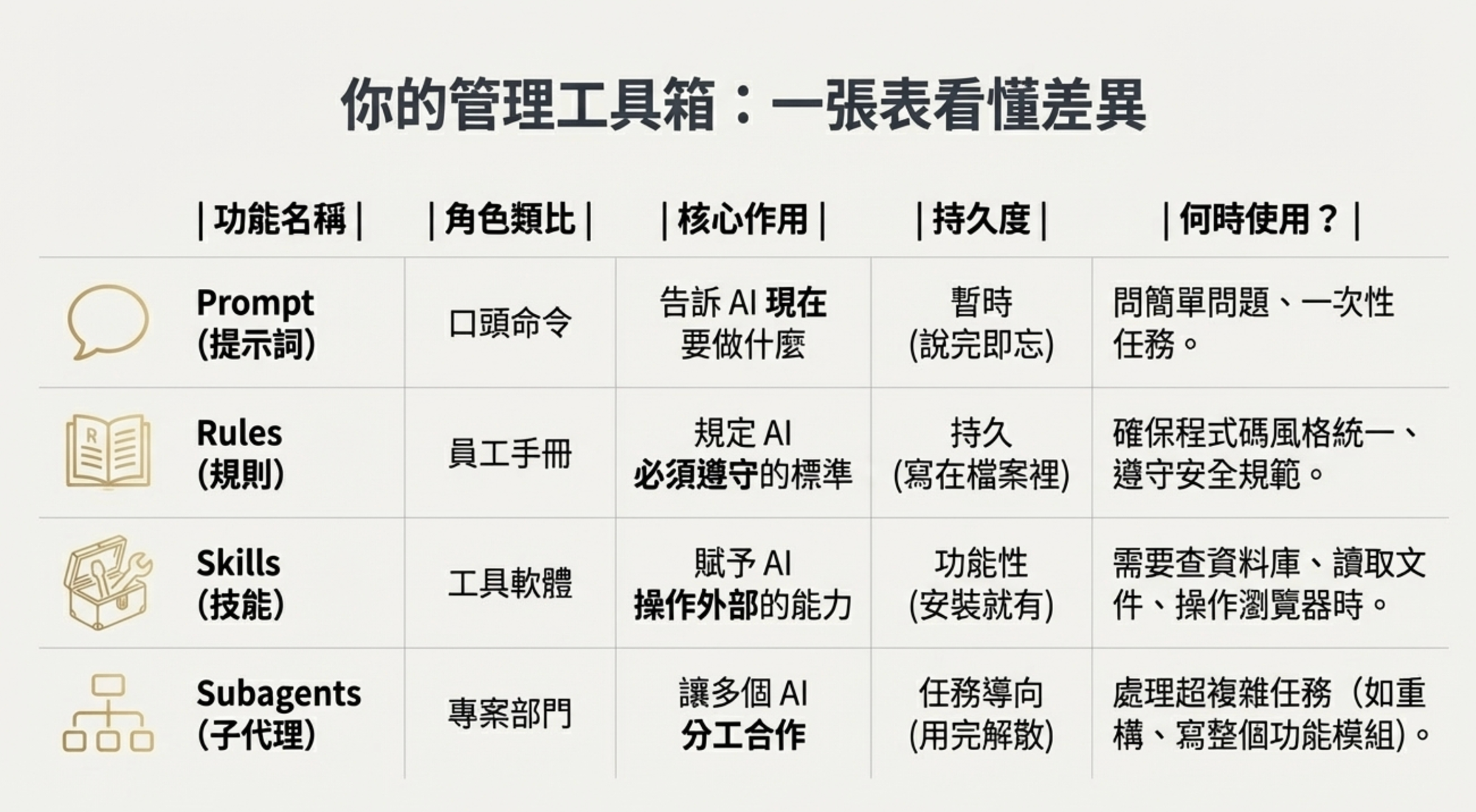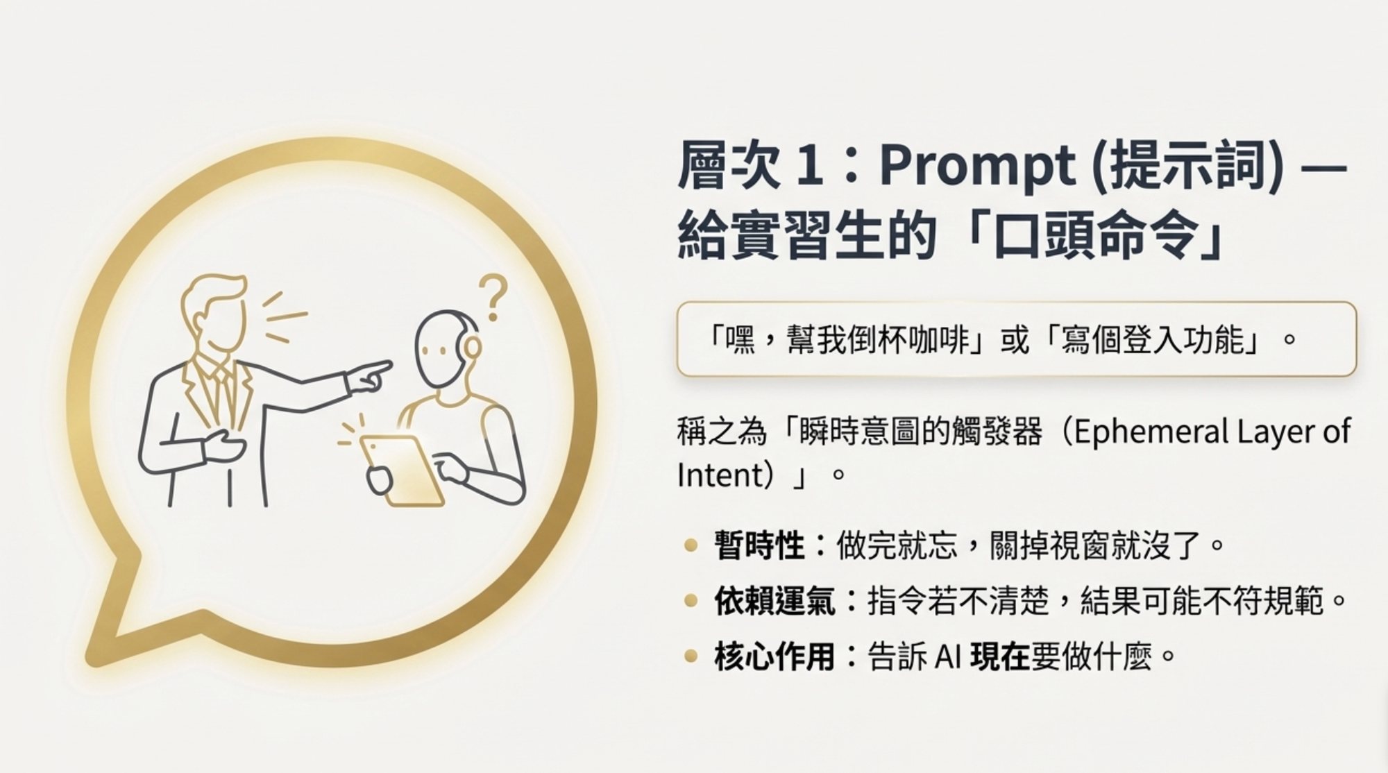 | Prompt | 口頭命令 | 告訴 AI「現在做什麼」 | 暫時 | 一次性任務、簡單問答 |