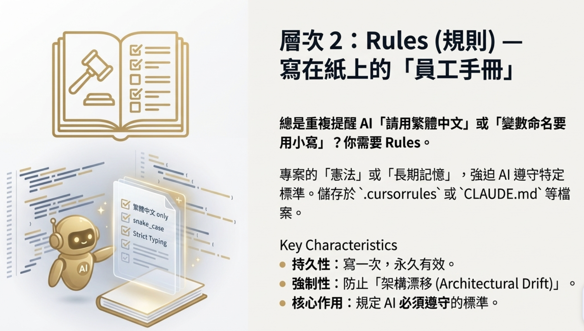 如果你發現自己每次都在提醒 AI:「請用繁體中文」、「命名規則一致」、「不要把金鑰寫進程式碼」,那你缺的不是 Prompt,而是 Rules。