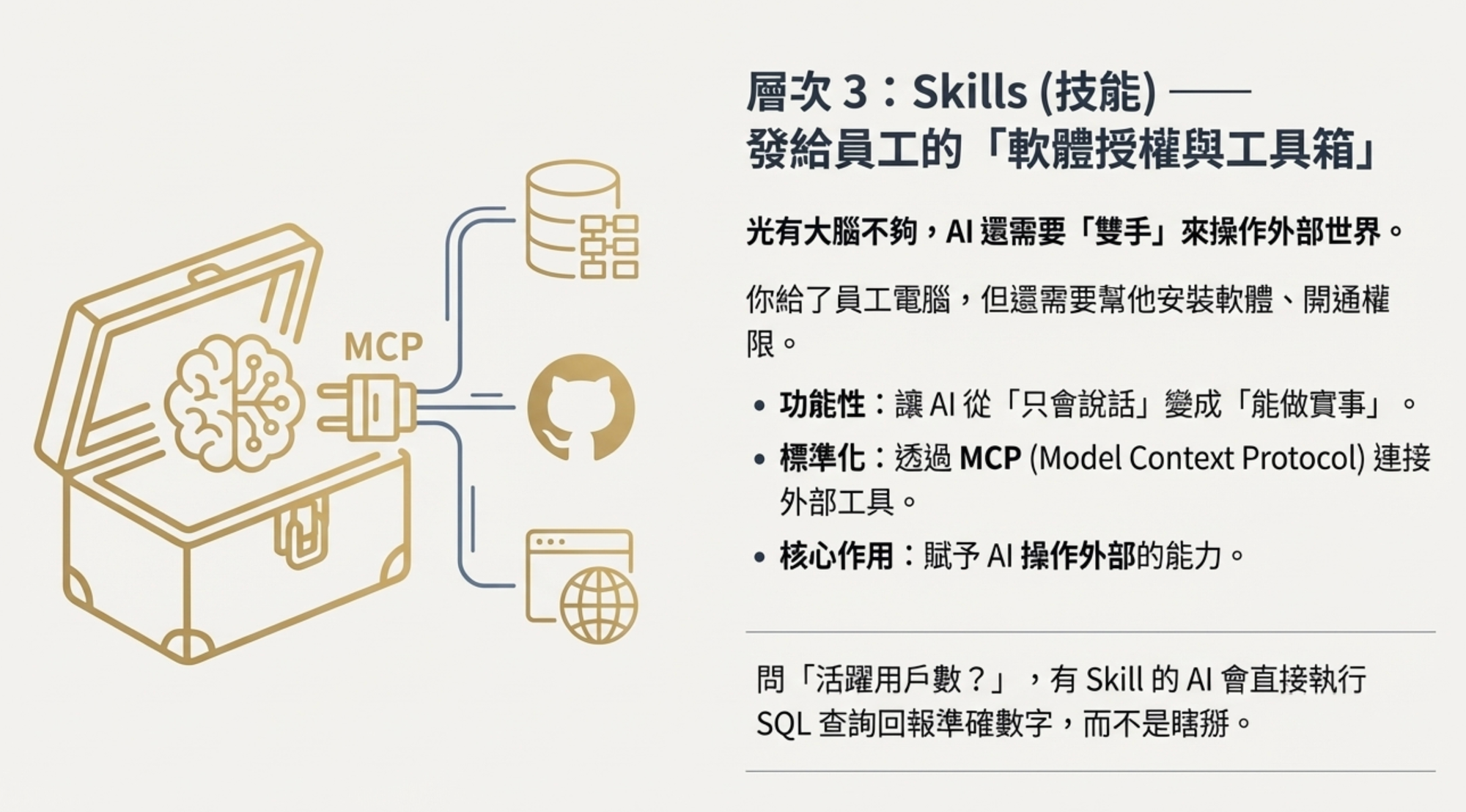 Skills 指 AI 與外部工具互動的能力,常透過標準化介面連接(例如 MCP:Model Context Protocol)。你可以把它理解成:替 AI 插上外接設備與權限。