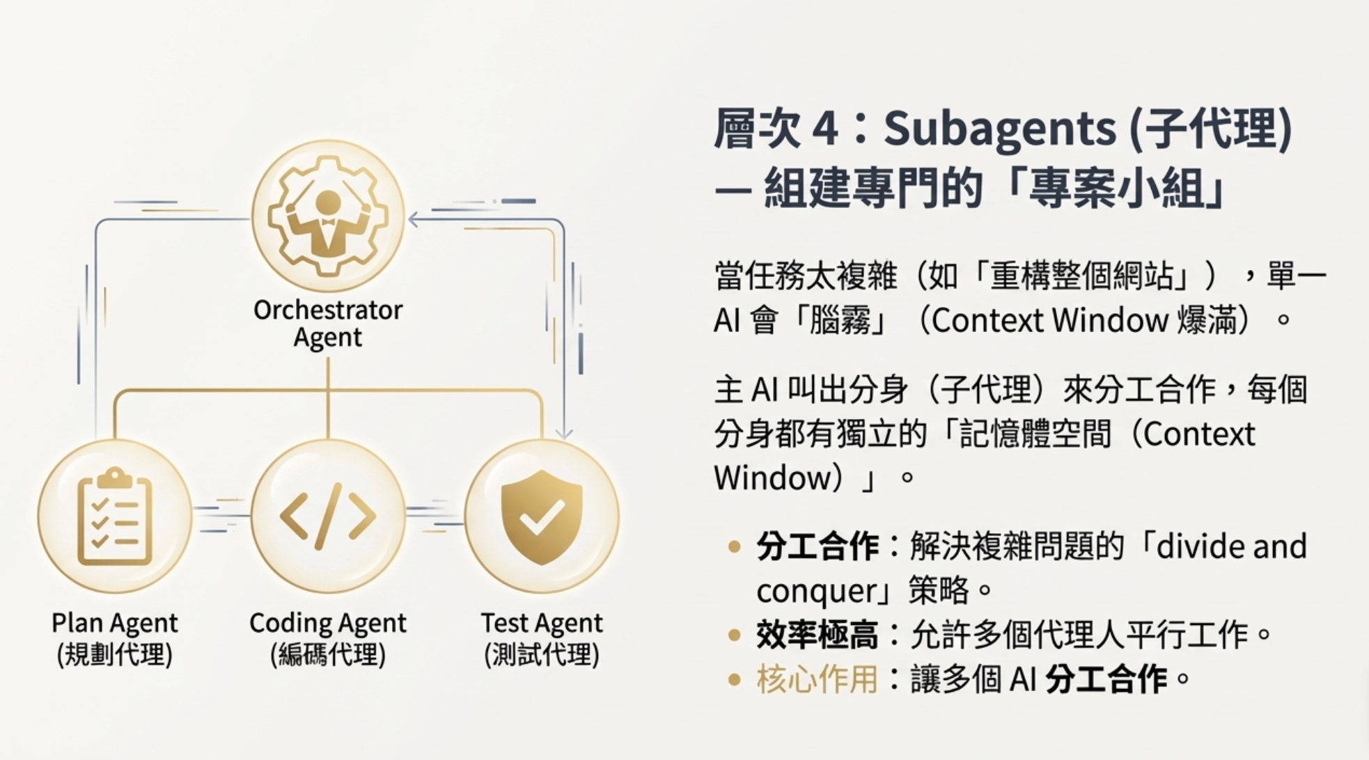 | Subagents | 專案小組 | 讓多個 AI 分工合作 | 任務導向 | 大任務:重構、模組開發、系統整合 |