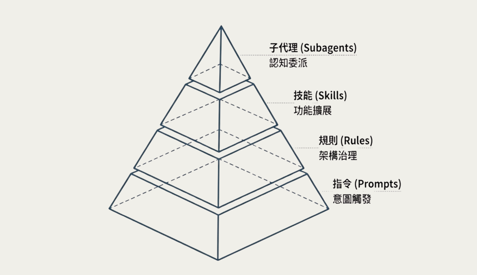 這篇文章會用最直白的職場比喻,帶你搞懂四個關鍵層次:Prompt(提示詞)、Rules(規則)、Skills(技能)、Subagents(子代理),並補上「新手如何落地」的做法,讓你從 Vibe Coding 的快,走向真正可控、可複用、可迭代的穩。
