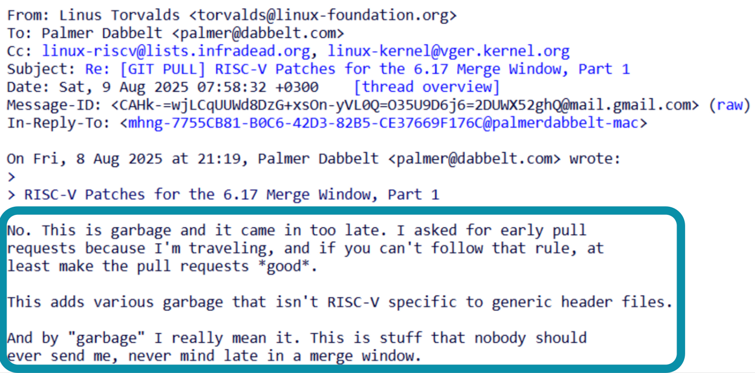 一位開發者提交了 RISC-V 的補丁,不但遲交,還在公共頭檔裡塞了特定架構定義。Linus 直接回覆: