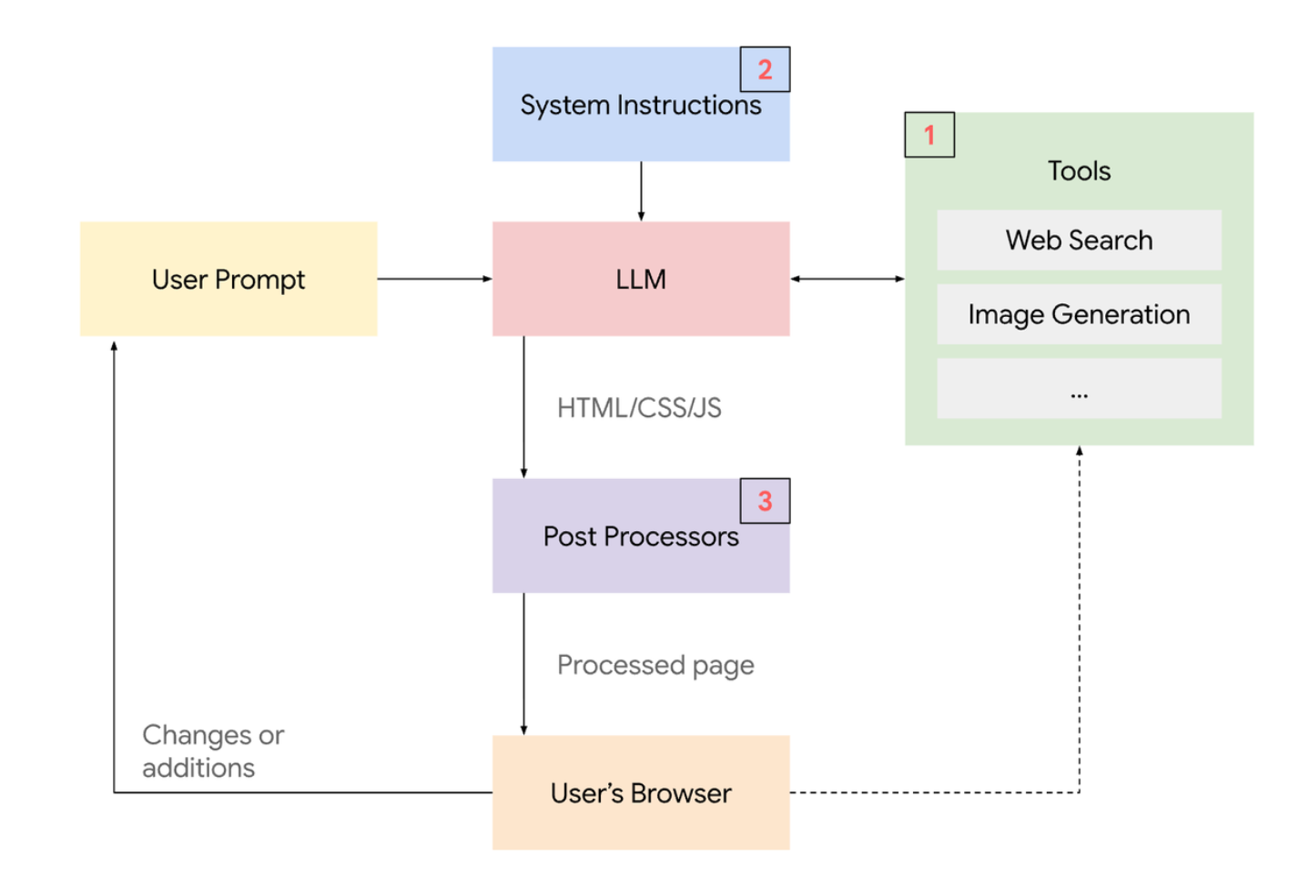 傳統的 LLM(大型語言模型)無論多強大,最終輸出的形式大多侷限於線性文本或靜態圖片。然而,Google 提出的 Generative UI 核心理念是: